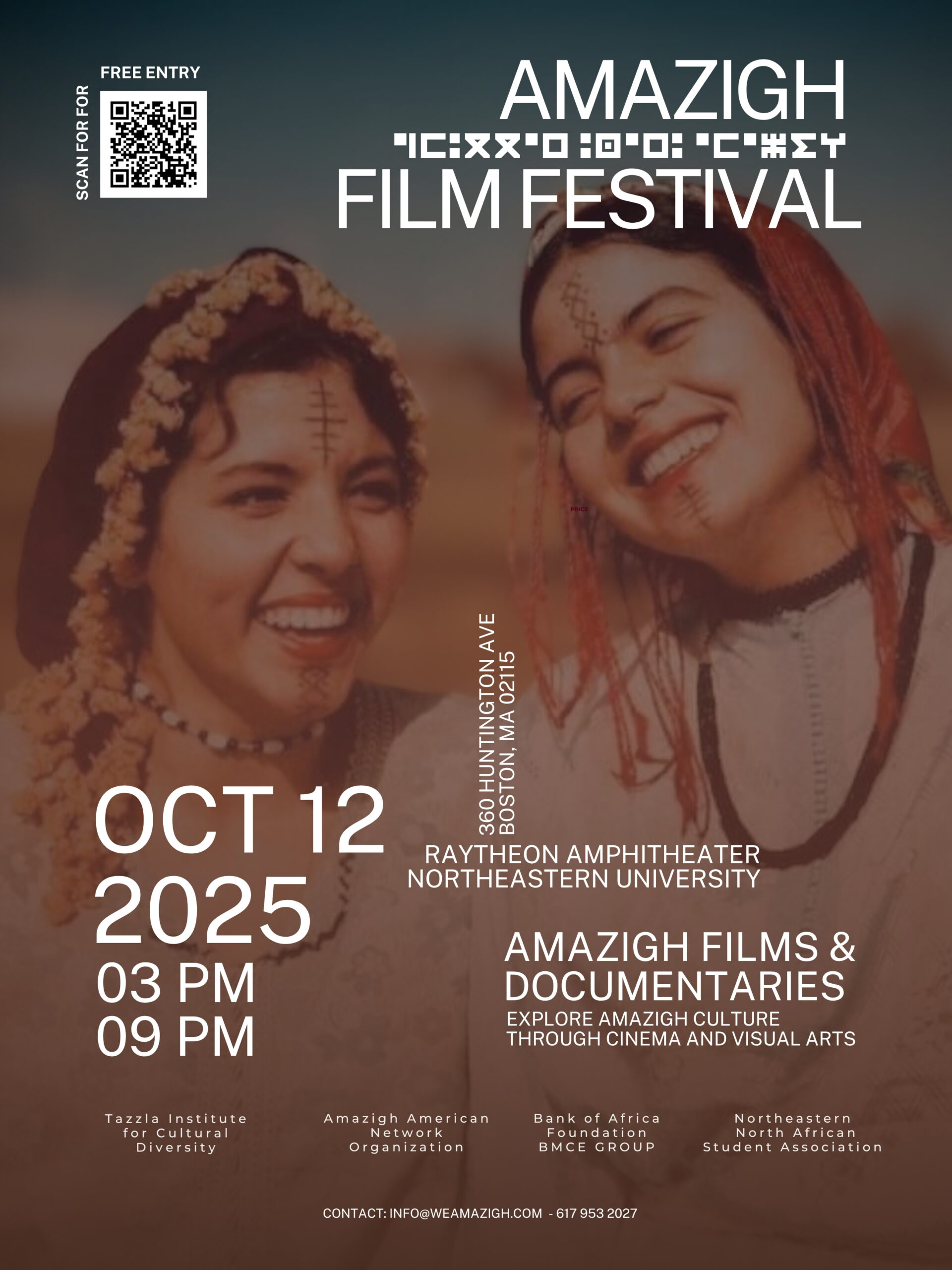 On October 12, 2025, A celebration of Amazigh culture through films and documentaries. This years event will be held at Northeastern University in Boston and it is presented the 2025 edition is presented in partnership with the Northeastern North African Student Association and the Tazzla Institute for Cultural Diversity. Register free here